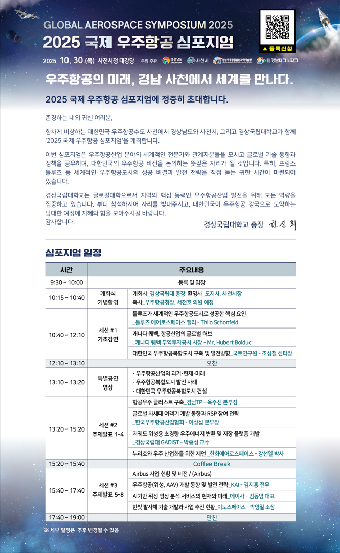 경상국립대학교는 경상남도와 사천시의 적극적인 지원 아래, 대한민국 우주항공수도로 도약하는 사천에서 2025 국제 우주항공 심포지엄을 개최하게 되었습니다.