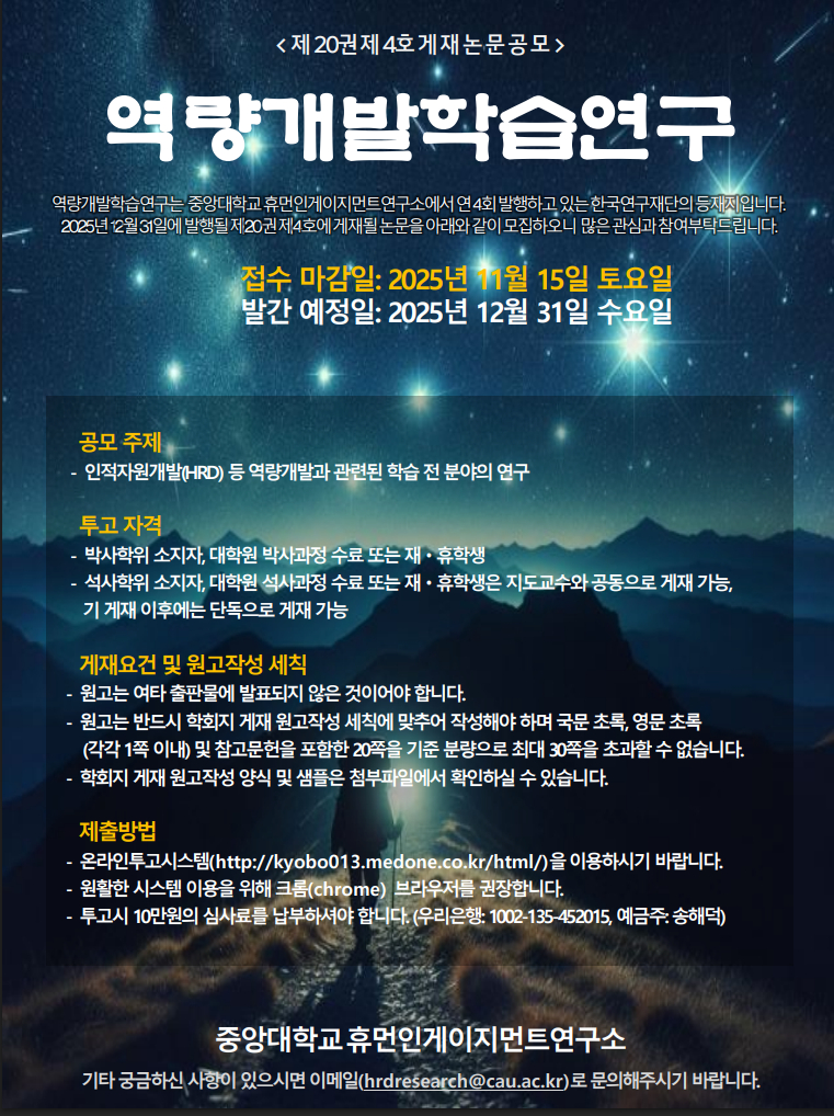 중앙대학교 Human Engagement Institute(휴먼인게이지먼트연구소) 『Journal of Competency Development & Learning』은 『역량개발학습연구』의 영문명으로 연 4회 발간되는 한국연구재단 등재 학술지입니다. 『JCDL』 Volume 20, Issue 4에 게재할 우수한 논문을 다음과 같이 공모하오니, 관심 있는 연구자들의 많은 참여 바랍니다.