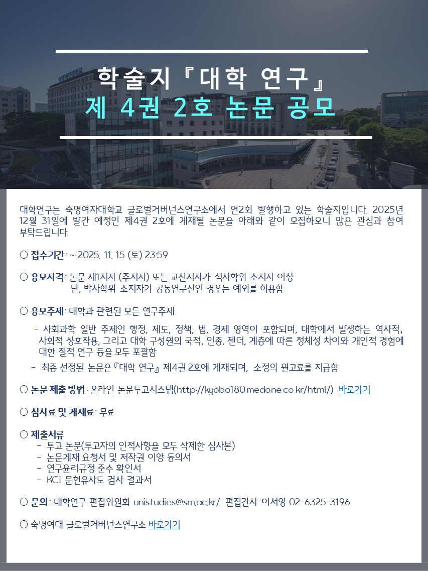 숙명여대 글로벌거버넌스연구소에서 발행하고 있는 『대학연구』 학술지 입니다.
