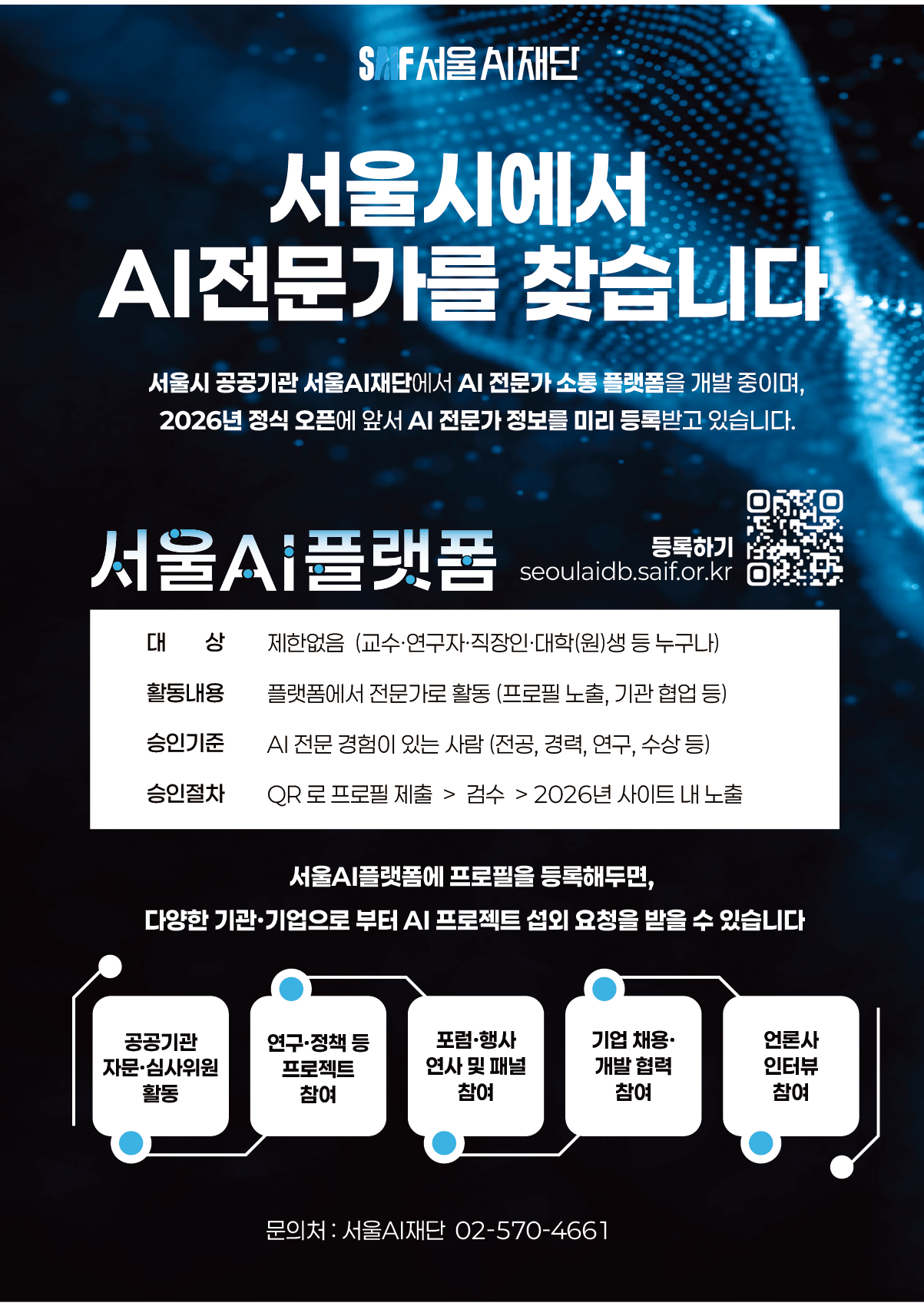 서울특별시 출연기관인 서울AI재단은 AI 전문가를 한곳에서 탐색·연결할 수 있는 ‘서울AI플랫폼’을 구축하고 있으며, 2026년 2~3월 중 정식 오픈을 앞두고 있습니다.